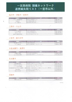 ![]() | 2019年7月より一宮西病院副院長の山口啓二先生のご協力で「頭痛ネットワーク連携鍼灸院リスト」に当院を紹介してもらっています。投薬でなかなか効果の出ない頭痛患者様を紹介頂いています 鍼施術の効果は医師にも認められています |